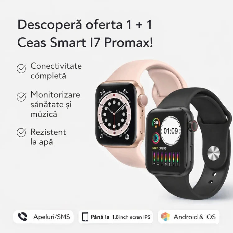 Pachet! 1+1 Ceas Smart I7 Promax, apeluri/sms/social media, monitorizare, somn, ritm cardiac, muzica, rezistent la apa.
